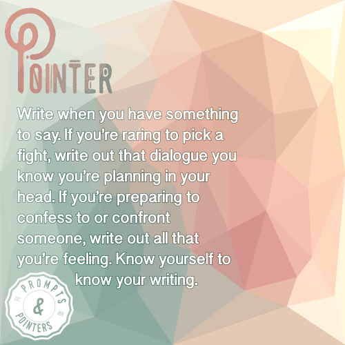 Write when you have something to say. If you’re raring to pick a fight, write out that dialogue you know you’re planning in your head. If you’re preparing to confess to or confront someone, write out all that you’re feeling. Know yourself to know your writing.