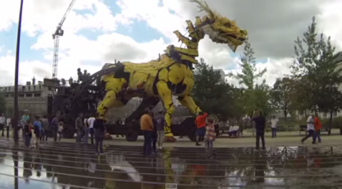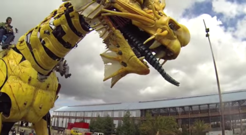 Behold the awesomeness that is Long Ma the fire-breathing dragon-horse, the latest creation by French artist François Delarozière and his art production company La Machine. The 46-ton kinetic sculpture stands almost 40 feet tall and features articulated limbs that can gallop, rear up, and fold beneath him when he wants to sit down. His neck rises and falls and his wonderfully expressive face features eyes that open and close. Best of all, his chest swells from the pressure building in his lungs before he exhales fantastic plumes of smoke from his nostrils and jets of fire from his mouth.