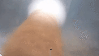 A powerful dust-wrapper tornado towering above. This was filmed near a trailer park in North Dakota. Here’s the source video. Someone must have been very brave to film this.