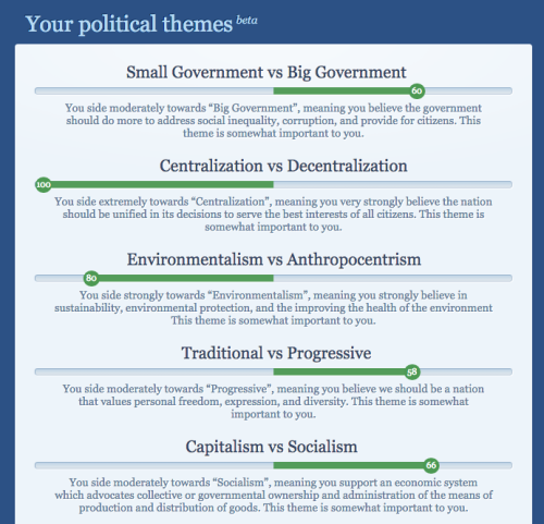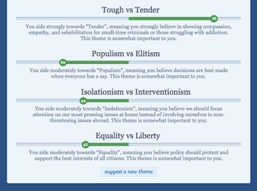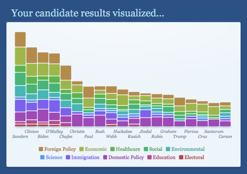 This is a quiz that tells you which US presidential candidates share similar views to yours. It’s based purely on your stances on the issues, and it’s simple and straightforward and super informative. My results are displayed above, just as an example. As you can see, my views align most with Bernie’s, though HRC’s a relatively close second.
