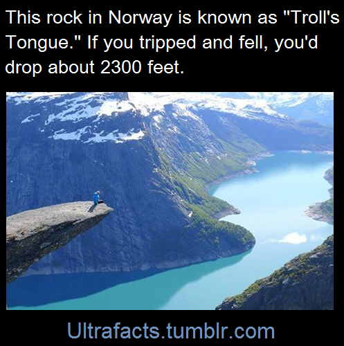 Trolltunga (Troll’s tongue) is a piece of rock jutting horizontally out of a mountain about 700 metres (2,300 ft) above the north side of the lake Ringedalsvatnet in the municipality of Odda in Hordaland county, Norway. The cliff is located east of the Skjeggedal area, about 10 kilometres (6.2 mi) east of the village of Tyssedal and the Sørfjorden (a branch off of the main Hardanger Fjord).