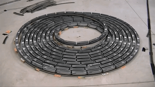 Model train enthusiast James Risner used his collection of HO-scale railroad tracks and model trains to create this endless spiral on the floor of his living room. Powered by several HO-scale locomotives, Risner’s clever design (which can also work in reverse), allows the long train to enter and exit the spiral in a perpetual loop creating a hypnotic effect.