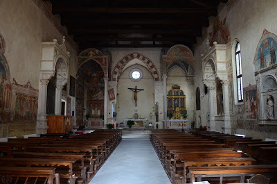 The inside of the church is 108 ft (33 m) long, 14 ft (45 m) wide, and 39 ft (12 m) high. The walls are entirely covered with frescoes and paintings by both known and unknown artists (among them Antonello da Serravalle, Francesco da Milano, Marco Vecello, Antonio Rosso di Cadore, Antonio Zago).