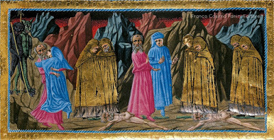 Detail of miniature of Dante and Virgil encountering three couples of hypocrites, clad in gilt hoods, while on the ground are stretched Caiaphas and Annas, in illustration of Canto XXIII. (Tuscany, Siena?), 1444-c. 1450London, British Library, Yates Thompson, 36 fol-42b Hypocrites
