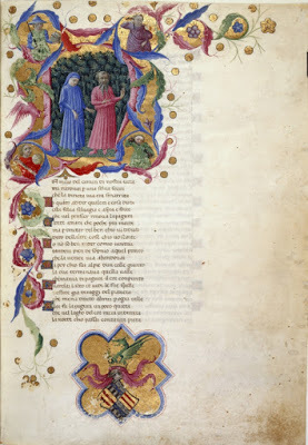 Historiated initial ‘N’(el) of Dante and Virgil in a dark wood, with four half-length figures representing Justice, Power, Peace, and Temperance, with the arms of Alfonso V below, at the beginning of the Divina Comedia, Italy (Tuscany, Siena?), 1444-c. 1450, Yates Thompson MS 36, f. 1rCOPYRIGHT NOTICE:
