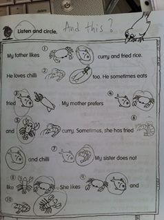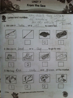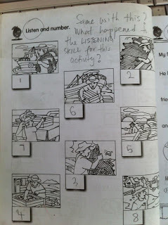It's sad when the ministry puts listening skills into the teaching of English, and the teacher does this on top of the limited hours they have for this language. I don't think she expected to get a NOTE from a parent written on the activity book or to even think that someone was checking their children's work and of all language ENGLISH. (By the way, the book is not even marked once, and the 2nd term has already started.)