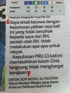 Extracted from Kosmo!Kosmo papers and many others calling this GE13 as a 'Chinese Tsunami’ which evidently still made BN in power, then quoting Datuk Seri Mohd. Ali Rustam (The Chief Minister of Melaka who lost his Parliamentary seat at Bukit Katil) who said he was disappointed that this elections weren’t in the best favour of BN and that all this proves that the Chinese are ungrateful towards all that the government has done for them; is by far the lamest statements anyone can make. Then again, I stand corrected, the last few weeks Malaysia has seen more than enough stupid lame comments flowing out of the mouth of our political leaders who are once again elected to run this country of ours.