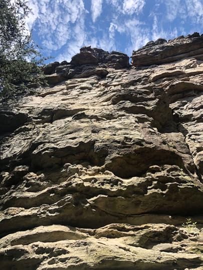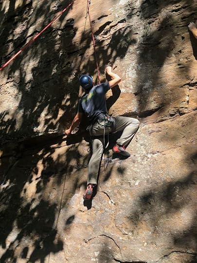 Next we climb Oyster, where I watched the woman fall yesterday. I do not feel ready to lead it, so my friend leads and anchors the rope. I go next, safely under a top rope, meaning falls will be limited to inches. I expect to struggle with the moves, given the weakness I felt on the 5.9 earlier, but everything comes together this time. I climb strong and well. I find and take the rests. When I reach the crux, I climb through without trouble. At the top, I briefly look down at the ground eighty feet below. This might be my tallest climb yet. I do not feel afraid, which tells me I am no longer the person I was a year ago.
