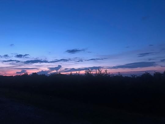 I walk the campground before night settles. The trees are silhouetted against a deepening blue. Campfires come to life around me, some of them atop hundred-foot cliff edges overlooking a lake. Guitar chords and youthful laughter accompany the wafting woodsmoke.
