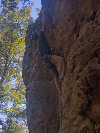 It is soon my turn. I have not climbed outdoors in months, thanks to COVID19 and my move to Alabama. I have been training on a small home wall in my garage, but have no idea how that will translate out here, on sustained routes. I start up what should be an easy 5.9 called My Dog Has Fleas, but after a short ways I am pumped. I struggle through it and complete the route without falling, but I am embarrassed and flustered by my weak performance.