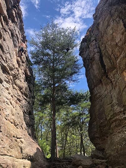 The view from my tent immediately upon waking.My climbing partner will not arrive until lunchtime, but a gregarious gentleman named John invites me to climb with his group. He might be the only person besides me in the crag who is older than 30. John is a professor, climbing with a group of undergraduates from his university. His ease with these young people, and their full-hearted acceptance of him, renews my hope for myself. It confirms that we are only ever as old as we feel. I melt right into the easy camaraderie of the group.