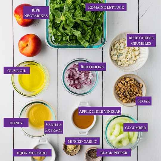 Romaine Lettuce - Crisp and hydrating, perfect for a fresh base.Ripe Nectarines - Juicy and sweet, adding a fruity twist.Cucumber - Refreshing and crunchy, great for texture.Red Onions - Sharp and flavorful, adding a bit of bite.Blue Cheese Crumbles - Rich and creamy, offering a bold contrast.Chopped Walnuts - Adds a satisfying crunch and nutty flavor.See recipe card for quantities.