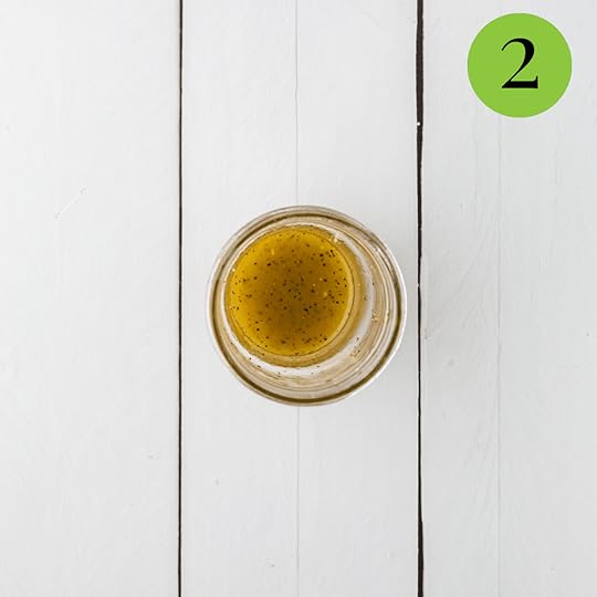 1. Make the dressing by combining olive oil, vinegar, honey and chopped mint leaves into a jar with a lid. Shake vigorously to combine.