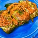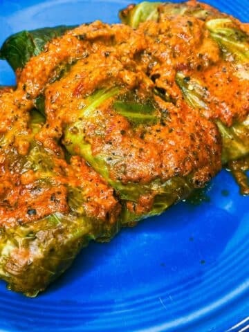 11. Pour remaining roasted red pepper sauce on top of cabbage rolls. Bake for approximately 30 minutes until cabbage is fully cooked.