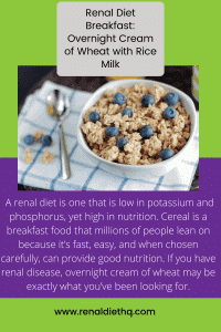 If you have kidney disease, there are many reasons why your breakfast matters. A renal diet is one that is low in sodium, potassium, phosphorus, and protein, yet high in nutrition. Cereal is a breakfast food that millions of people lean on because itâs fast, easy, and when chosen carefully, can provide good nutrition. If you have renal disease, overnight cream of wheat may be exactly what youâve been looking for.