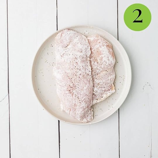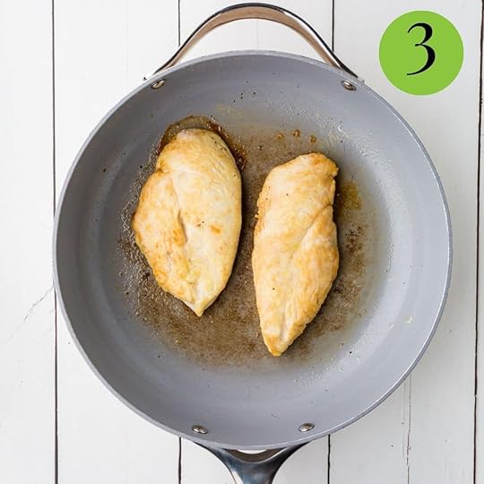 2. Season with pepper, and dredge each piece in flour, shaking off any excess. Set aside. Heat ½ tablespoon olive oil in a large skillet over medium high heat. Add the chicken and cook for 5-6 minutes per side or until the chicken is cooked through and has a golden brown crust. Remove the chicken from the skillet and set aside.