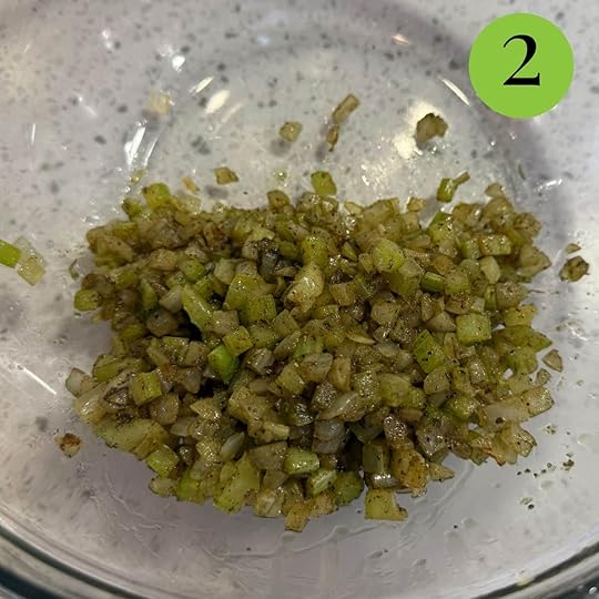 3. While the wild rice is cooking, heat 1 tablespoon vegetable oil in a medium skillet. Add the onion, celery, poultry seasoning, and pepper. Cook on medium heat until softened, about 7-10 minutes. Stir in the garlic and cook for 1 minute more. Transfer to a large bowl and set aside.