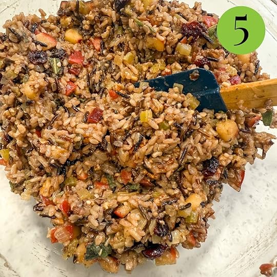 5. Put the cooked apples and wild rice blend into the bowl with the onion and celery mixture. Add in the pecans, cranberries and sage. Stir together.