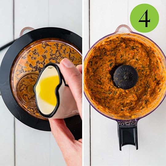 5. Turn on the food processor and blend well. Add rest of olive oil to the mixture and continue to process until the mixture is a nice thick consistency and no more chunks remain.