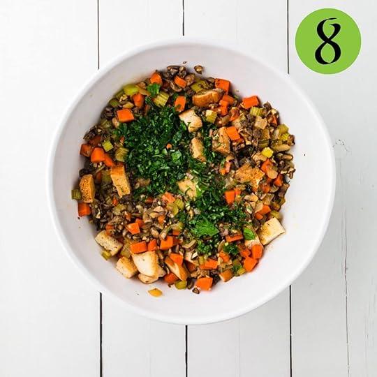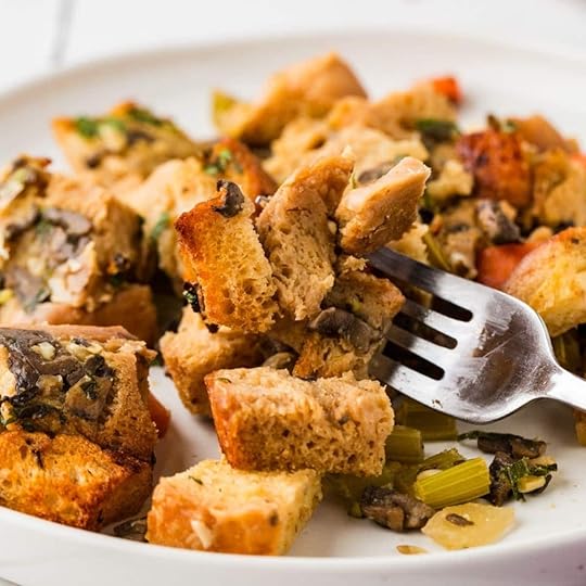 Author: Mathea Ford, MBA, RDN, LD Prep Time: 5 minutes Cook Time: 1hr 30 minutes Total Time: 1hr 35 minutes Yield: 12 Category: Entree Method: Bake Cuisine: American Diet: Vegetarian Ingredients Units USM 14 ounce loaf of sliced french bread loaf, cut into ½ in cubes - about 10 cups3 tbsp olive oil1 ½ cups diced white onion1 ½ cup diced carrots1 cup diced celery4 cups white button or cremini mushrooms, stems removed and chopped small4 tbsp minced garlic3 tbsp poultry seasoning1 tbsp balsamic vinegar2 cups low sodium vegetable broth2 large eggs¼ cup chopped fresh parsley Cook Mode Prevent your screen from going dark Instructions Preheat oven to 325'F. Spread cubed bread onto a baking sheet. Bake bread until mostly dried out and crisp, about 30 minutes. Toss it halfway through. Once bread is done toasting, set aside to cool and increase oven temperature to 400'FHeat 3 tablespoon of olive oil in a large skillet over medium heat. Add the onions, carrot and celery and cook until they have begun to soften, about 5 minutes.Add mushrooms to skillet, and cook until they have begun to brown and loose their liquid. This is about 6-8 minutes.Add garlic and poultry seasoning and mix to combine.Add balsamic vinegar and scrape up the brown bits on the bottom of the pan. Add 1 cup of broth and simmer for 2-3 minutes.Add bread cubes to a large bowl, then pour the vegetable and broth mixture over the top.Mix eggs and remaining cup of broth in a small bowl then pour over the bread and vegetable mixture.Add the chopped parsley and mix very well, letting the bread soak up the broth.Spray a 9x13 in pan with pan spray. Place the prepared stuffing in the pan.Bake in the oven until the stuffing is set and top is crunchy and brown. About 30 minutes. (function(){ window.addEventListener( 'message', function( event ){ if ( ( 'https://nutrifox.com' !== event.origin && 'https://nutrifox.test' !== event.origin ) || typeof event.data !== 'string' ) { return; } var payload = JSON.parse( event.data ); switch ( payload.event ) { case 'setHeight': var iframe = document.getElementById( 'nutrifox-label-' payload.recipeId ); iframe.style.height = payload.height 'px'; break; } } );}()); Did you make this recipe?Share a photo and tag us â we can't wait to see what you've made!