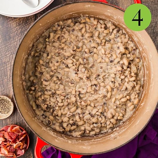 4. Add vinegar, which will make a gravy like appearance to the peas. Ladle even amounts into 4 serving dishes. Serve over rice if desired. Top with crumbled bacon.