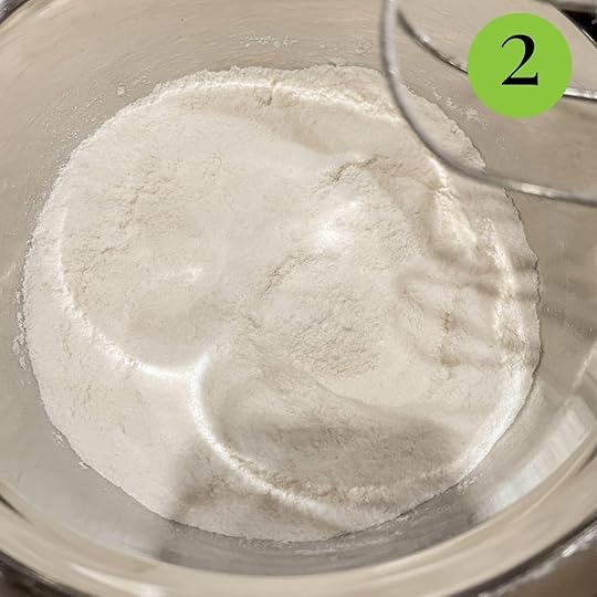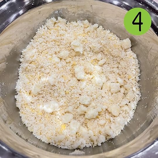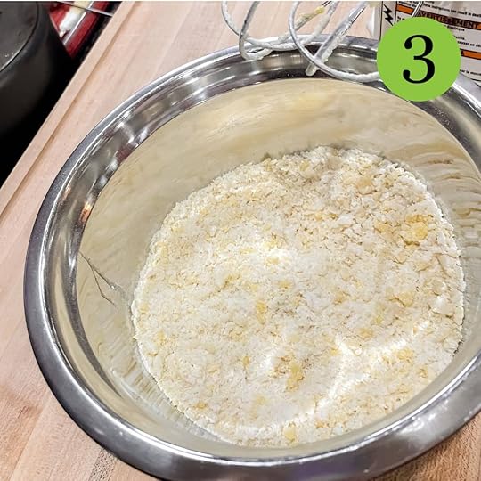 Then dice up the room temperature butter, and put in the bowl, then using the beaters, mix it together until completely incorporated. It will still appear crumbly.