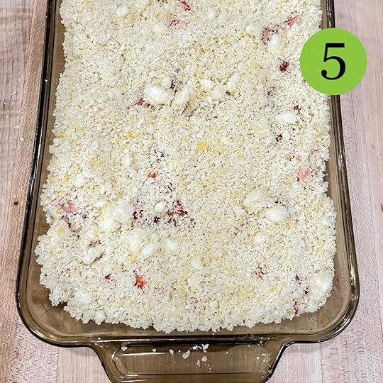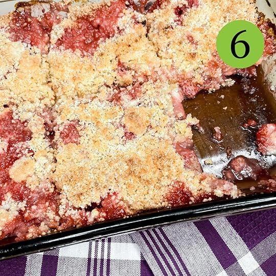 Spread this over the berries. Bake for 45-50 minutes, depending on how brown you want the crust. Make sure the filling is bubbling. Cool slightly. Serves 6 from a 9x13 pan.