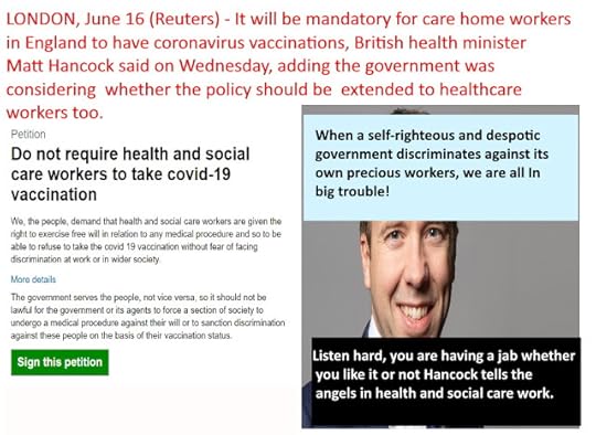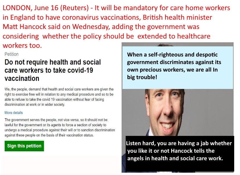 Laughing boy Matt Hancock is now running around like a headless chicken. He’s apparently seeking to intimidate any care worker into a questionable medical procedure that they may not want, or potentially sack them if they fail to tow his one-sided line on compulsory vaccination.