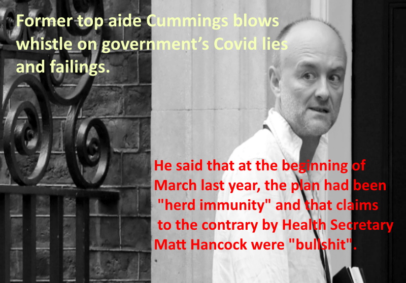 Prime Minister’s former top aide Dominic Cummings blows whistle on government’s Covid lies and failings.