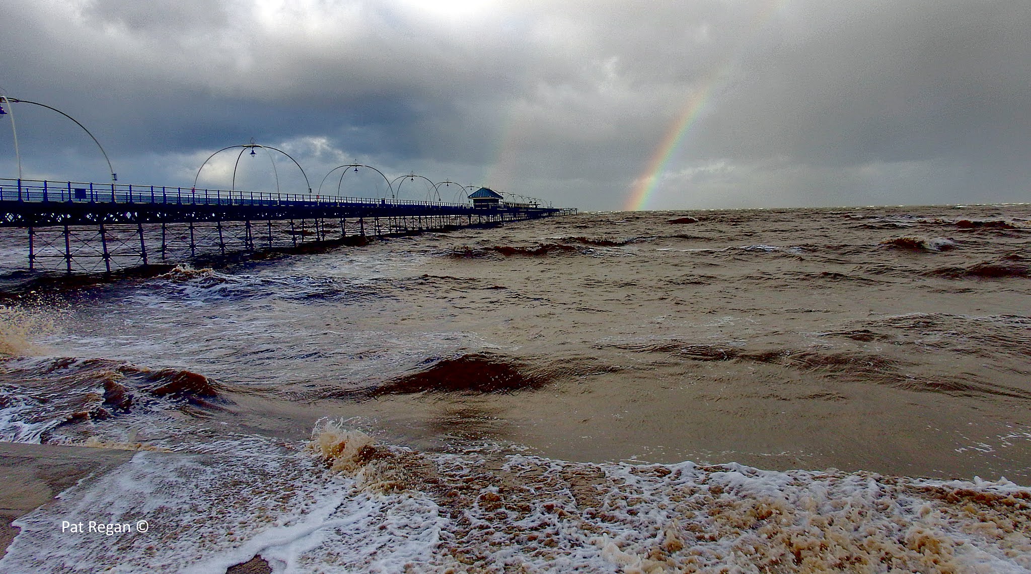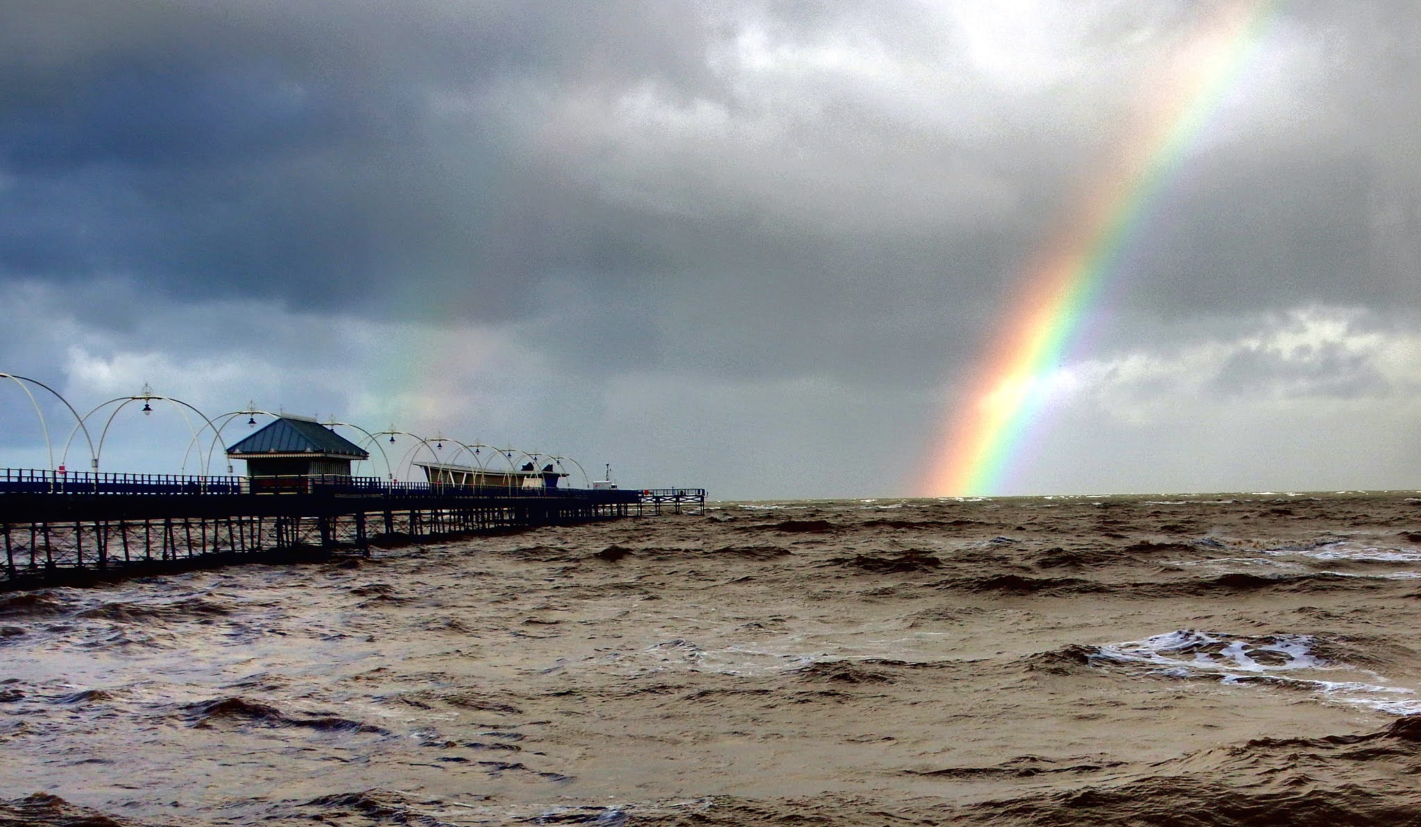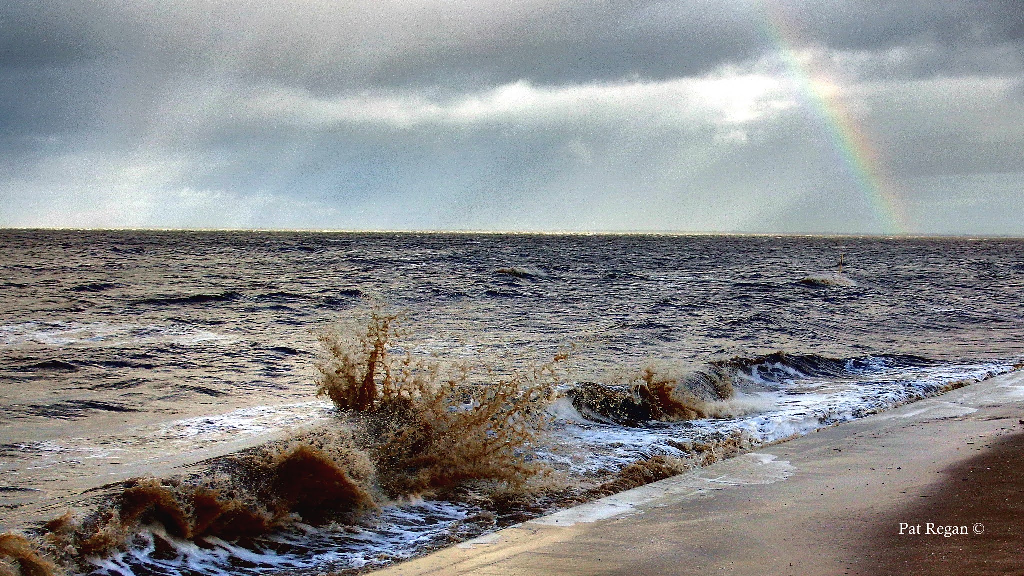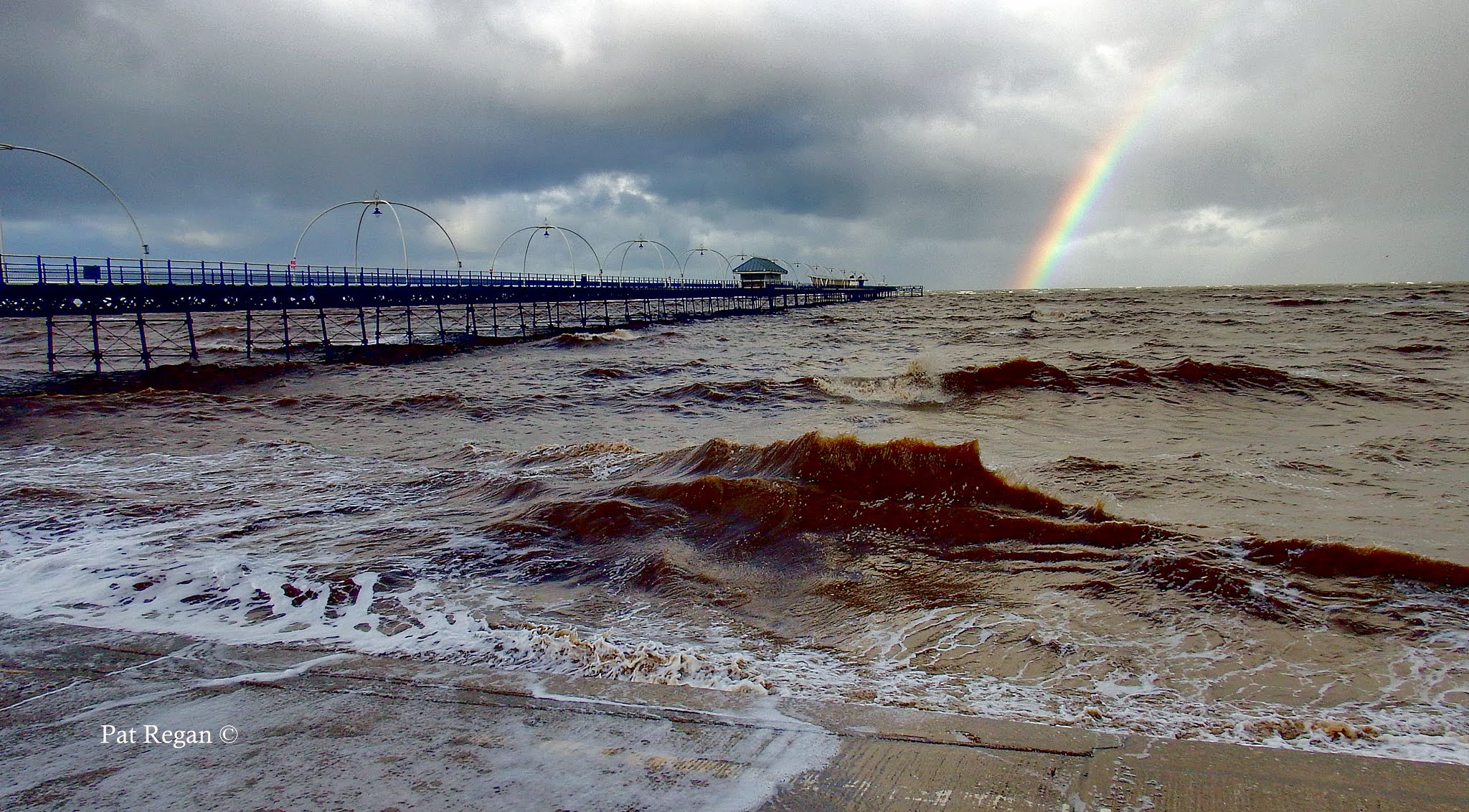 Sightseers and cyclists at the pier today were treated to an energetic high tide, along with vibrant rainbows over the Irish Sea.