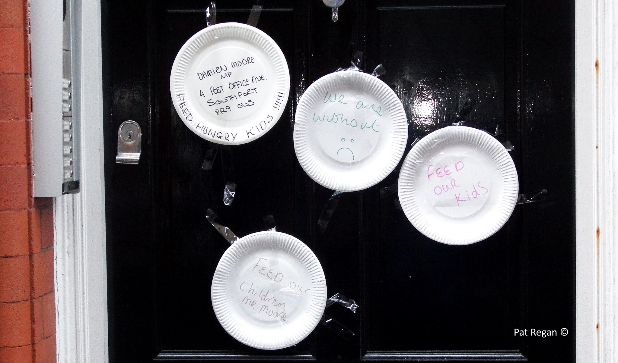 Masked public protestors sent a message of dissatisfaction to Southport’s Tory MP, Damien Moore, today. The small group left plates with messages written on them outside Mr Moore’s office in Post Office Avenue. He abstained on Labour’s motion calling to extend free school meals for the poorest children.