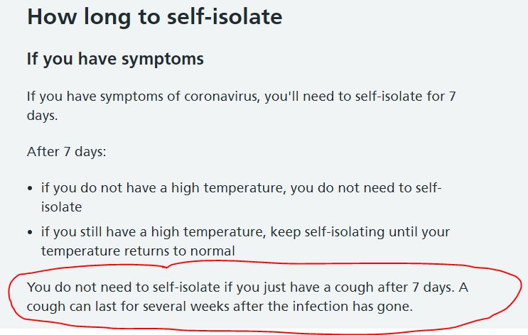 You do not need to self-isolate if you just have a cough after seven days. A cough can last for several weeks after the infection has gone.