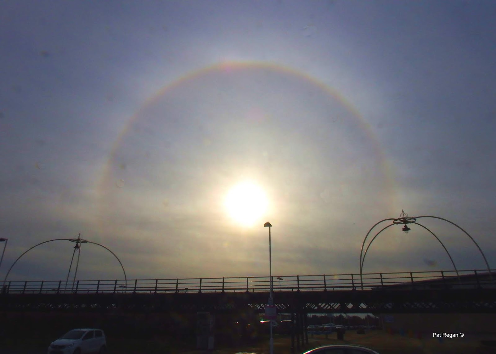 Known as a 22 degree halo or a sun halo, the ring is caused by sunlight passing through ice crystals in cirrus clouds within the Earth's atmosphere. Sometimes a higher/larger sun halo is also seen, which is called the supralateral arc.