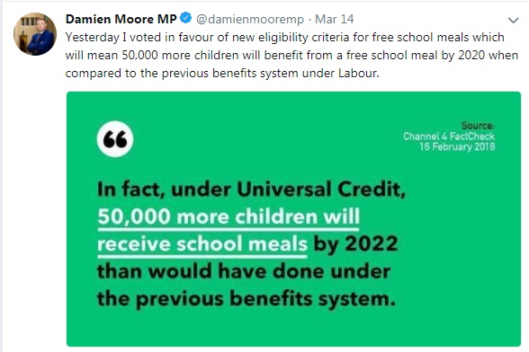Damien Moore on list of MPs who voted to remove guarantee of a hot meal for kids in low income families