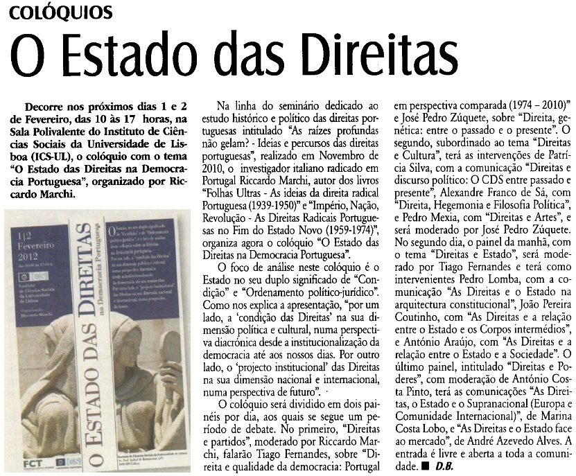 Nos dias 1 e 2 de Fevereiro de 2012, decorar�� no Instituto de Ci��ncias Sociais da Universidade de Lisboa, o Col��quio ���O Estado das Direitas na democracia portuguesa���.