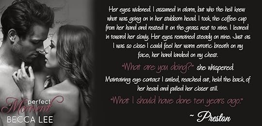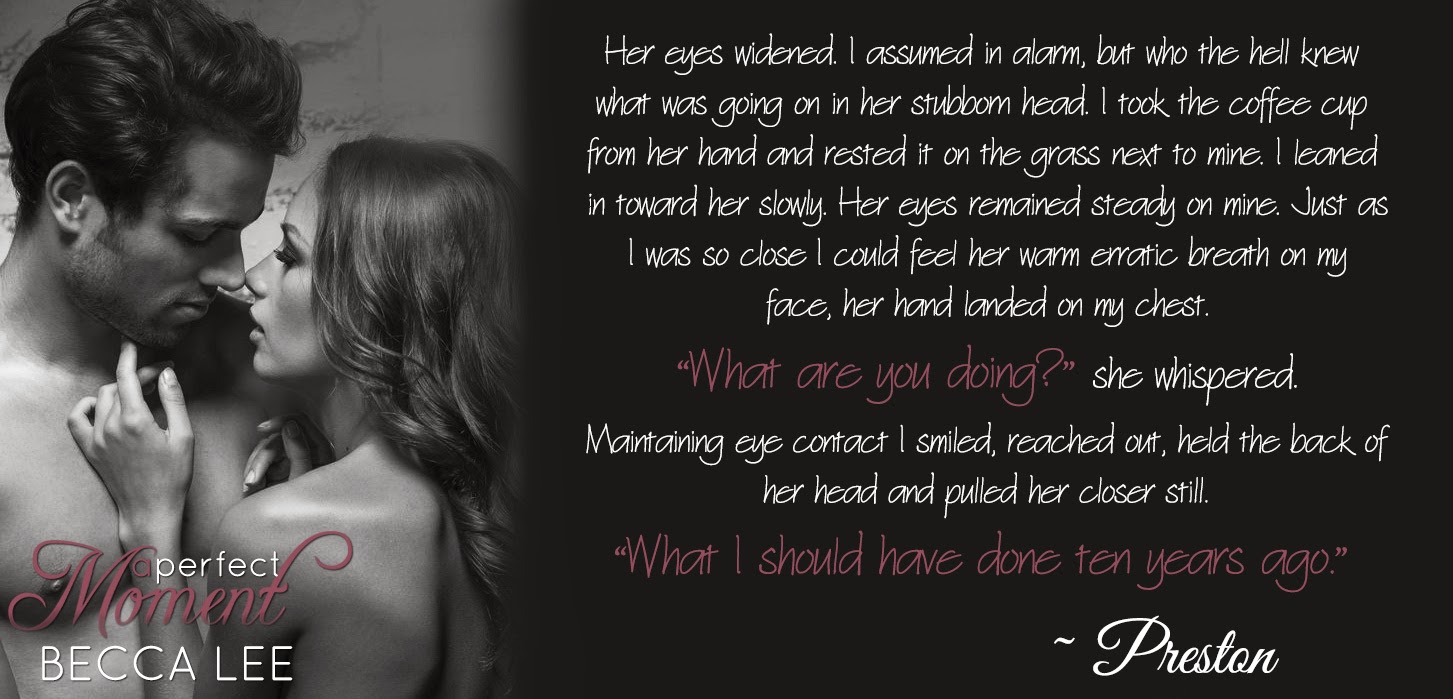 I smiled down at her, hoping that my voice and face would make it clear how honest I was being with her. “Now, we have fun. We make love. We tell our family.” She grimaced slightly at that, but I continued, “You learn to trust me.” She made to speak, but I put my finger on her lips. “I mean really trust. I know you trust me as your friend, but I need you to trust me with your heart.” My words had her smiling and her eyes glistening. I kissed her lightly on the lips. “Then, I plan for us to spend the rest of our lives together, having you in my bed whenever I want and having fun making babies.” I expected to blanch as my words formed. Me, not her. While I’d always loved her, doted on her, I’d never considered having a family. I was too young for shit like that, but hell, with El now in my arms, all I could think about was taking her bare and hoping to hell to have some of my swimmers take, and have our baby growing in her beautiful stomach. ~ Preston, A Perfect Moment