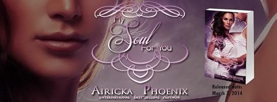 Title:My Soul For youAuthor:Airicka PhoenixPublisher:Fire & Ice PublishingRelease Day: March 7, 2014Genre:New Adult Contemporary, Thriller with strong elements of RomanceWarnings:Language and sexual contentFormats:eBook & PaperbackOther Novels: http://www.amazon.com/Airicka-Phoenix/e/B00906AGHMStalker Links: Author Website: http://airickaphoenix.com/Author/Author Facebook Page: https://www.facebook.com/pages/Airicka-Phoenix/252135634831614Touch Series Page: https://www.facebook.com/TouchSeriesByAirickaPhoenix?ref=hlDesign Page: https://www.facebook.com/pages/Airick...Morgana Phoenix Page: https://www.facebook.com/pages/Morgana-Phoenix/148839731972606Goodreads: https://www.goodreads.com/AirickaPhoenix Twitter:http://twitter.com/#!/AirickaPhoenixAmazon Author Page: http://www.amazon.com/Airicka-Phoenix...LinkedIn: http://www.linkedin.com/pub/airicka-p...Kobo: http://store.kobobooks.com/en-CA/Search?query=Airicka%20Phoenix&fcsearchfield=AuthorPinterest: http://www.pinterest.com/airickaphoenix/Barns & Nobles: http://www.barnesandnoble.com/c/airic...