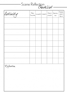 The second template that I made was originally designed as a way to expand on the checklist, but in reality, it can be used just as easily for a quick, overall reflection of the scene. The information that you put in each box can focus as lightly or as heavily as you want on either the physical aspects of the scene, the emotional aspects, or both, but the most important part of this template is the “next time” section.