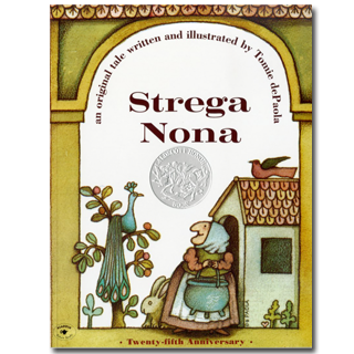 The Strega Nona stories by Tomie dePaola, which we used to read to our daughters when they were little. Strega Nona is the name of a folksy, Italian, grandmother-style witch who helps the people in her town with their troubles. She's like a child's version of Granny Weatherwax, a witch who doesn't do fancy magic, but cures headaches "with oil and water and a hairpin." The illustrations are colourful and homey too.