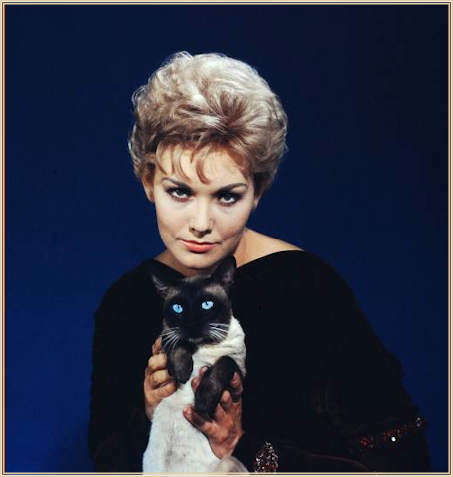 Gillian Holroyd in the movie Bell, Book, and Candle. Played by the sexy and luminous Kim Novak, Gillian is a modern witch living in New York City with a Siamese cat, Pyewacket, as her familiar. She meets the fiance of an old school adversary and decides to lure him away with magic, only to fall in love with him herself. With a great cast, including James Stewart as the love interest, Elsa Lanchester and Jack Lemon, it's a spell-binding comedy that was released in 1958.