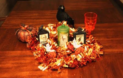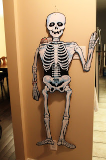 The palette for Halloween decorations matches the autumn landscape: pumpkin orange, fire yellow, and shadowy black. Take a look at my dining table centrepiece in the picture above to catch these colours. You'll see pumpkins, ghosts, skulls, and a raven, some of the main Halloween images. Throw in a witch and a skeleton, and you've pretty much got them all. Wait! I forgot the skeleton who greets you inside my front door. There he is.