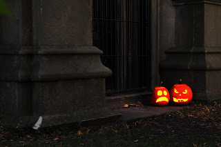 I just have a wee one this year, carved on the fly and not very elaborate, but I have to have one at my door to welcome all the ghouls, goblins, and princesses coming for a visit. I am proud, however, of the two pumpkins I carved for my second Anna Nolan mystery cover, Town Haunts. I wanted the pumpkins shot in front of a mausoleum. My husband, who once earned a living as a professional photographer, took the pictures. We were both scared that a cemetery employee would suddenly appear, demanding what we were doing there with a couple of pumpkins, but since we had chosen a secluded part of the graveyard, no one disturbed us. We were very respectful, by the way. Not even a burnt match was left behind.