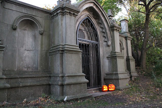 The next two covers were actually created from photographs from the old municipal cemetery in Hamilton, where we were living two years ago. Hah - in Hamilton, not in the cemetery! The second book, Town Haunts, takes place around Halloween. I came up with the idea of using jack-o-lanterns in front of a mausoleum. I'm very proud of the cover; I carved the pumpkins myself. This gives you an idea of the size of the mausoleum.