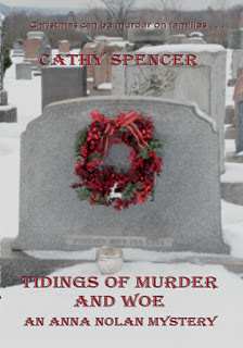 The third book, Tidings of Murder and Woe, was a break from tradition in that I took the cover photos myself. My husband, who once had his own professional photography business - you have to have a lot of careers when you're a performer - took the photos for the other covers, but he must have been unavailable that day. I wanted to take a stab at it myself, so back I went to the Hamilton cemetery with my own Christmas wreath and a few decorations. Here's the finished cover.