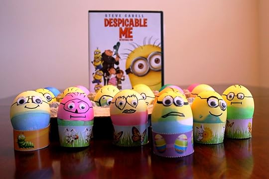 I saw a Facebook post on how to turn Easter eggs into Minions with dye, googly eyes, glue, string, and a Sharpie, and to make it even simpler, I left off the string. I got dye on my finger tips and, unfortunately, left marks on some of their heads. I also discovered that I'm not very good at drawing a circle around the top of an egg. After a while, I asked my husband, who's more crafty than I, to help me finish up because I was getting tired. Here's two pictures of the results. Not perfect, but cute. By the way, you'll notice that not all of the eggs are yellow and blue, like the Minions. It was too hard to resist using some of the other colours. My explanation is that the non-traditionally coloured Minions are cousins from foreign locales.