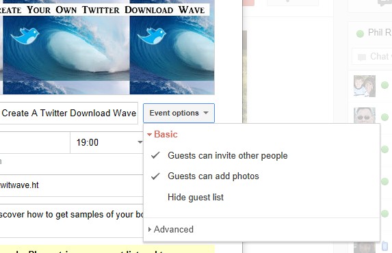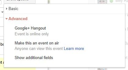 By clicking 'Advanced,' you'll be able to notify people that this is a Google Hangout, an on-air event, or provide a URL where people can learn more about the event. This is particularly important if you want people to register elsewhere or take a specific action. In the case of my event, to join a specific community in order to get access to the information.