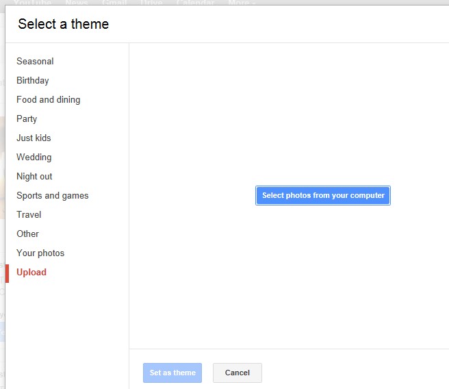 Of course, if you're a DIY design whiz, you'll probably want to upload your own cover photo. Creating a cover image that's unique to you and your specific event or book is a great way to differentiate it from any other created by the people you're following. To upload your own cover photo, choose 'Upload' from the list of theme options: