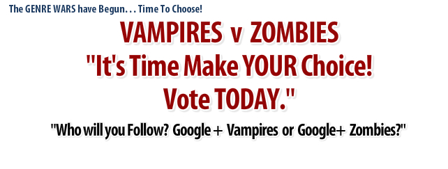 Last week I unleashed the first stage of Genre Wars which pitted Vampires against Zombies. It is of course a phony war. The idea behind Genre Wars is to arouse interest in the work of indie-authors within specific genres. It is obviously a marketing exercise designed to create an interest and buzz using the new social media network Google+. I really love the way Google+ allows you to organise and promote Events like Genre Wars. At the risk of becoming a bore, any writers worse fear, I would urge you to get involved in Google+ sooner rather than later. Create Google+ Pages and build a presence and a platform. You will be rewarded in the not too distant future as Google+ is steadily building a user base to rival the mighty Facebook.