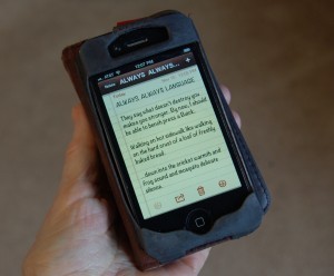 It’s always, always on my computer desktop and the top Note in my IPhone. I keep it handy because my Always, Always Language List is very important to me. The double “always” is to remind me of two things: how often I should listen for great language usage and how often I should WRITE IT DOWN when I hear it. (You think you don’t have to write it down, that you’ll remember. Trust me on this one, people—you won’t.)