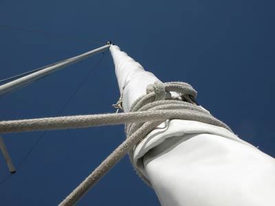 The bolt-cutters came out and the pigtail went away. The sail went back up smoothly and didn’t mess up either the top section or the top guard, meaning we could roll it up safely.